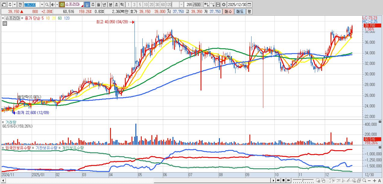 - 슈프리마 (39,100원 ▲ 1.96% , 시총: 2,838억, 거래량: 38,016, 거래대금:15억, KOSDAQ)