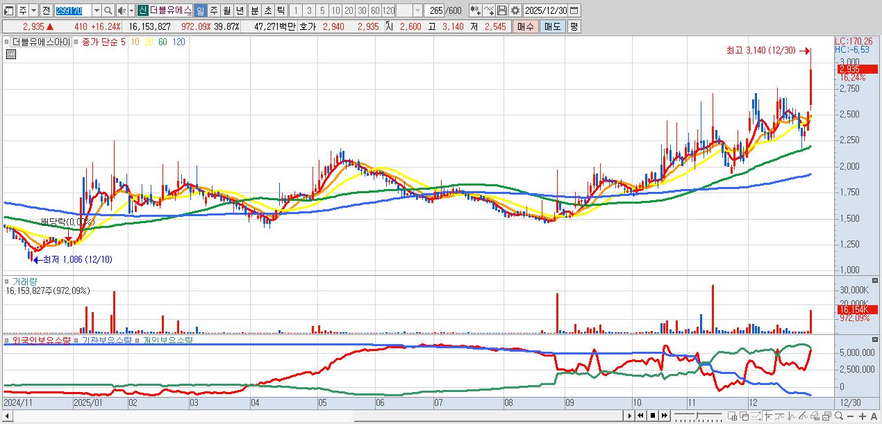 - 더블유에스아이 (2,935원 ▲ 16.24% , 시총: 1,189억, 거래량: 16,153,827, 거래대금:473억, KOSDAQ)