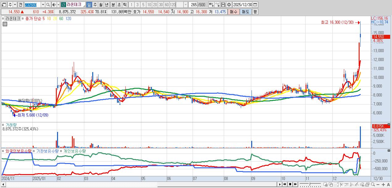 - 라온테크 (14,550원 ▲ 4.38% , 시총: 1,824억, 거래량: 8,875,372, 거래대금:1,319억, KOSDAQ)