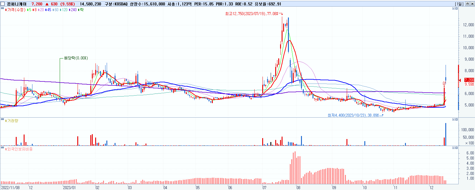 - 컴퍼니케이 (7,200원 ▲ 9.59% , 시총: 1,124억, 거래량: 14,616,304, 거래대금:1,126억)