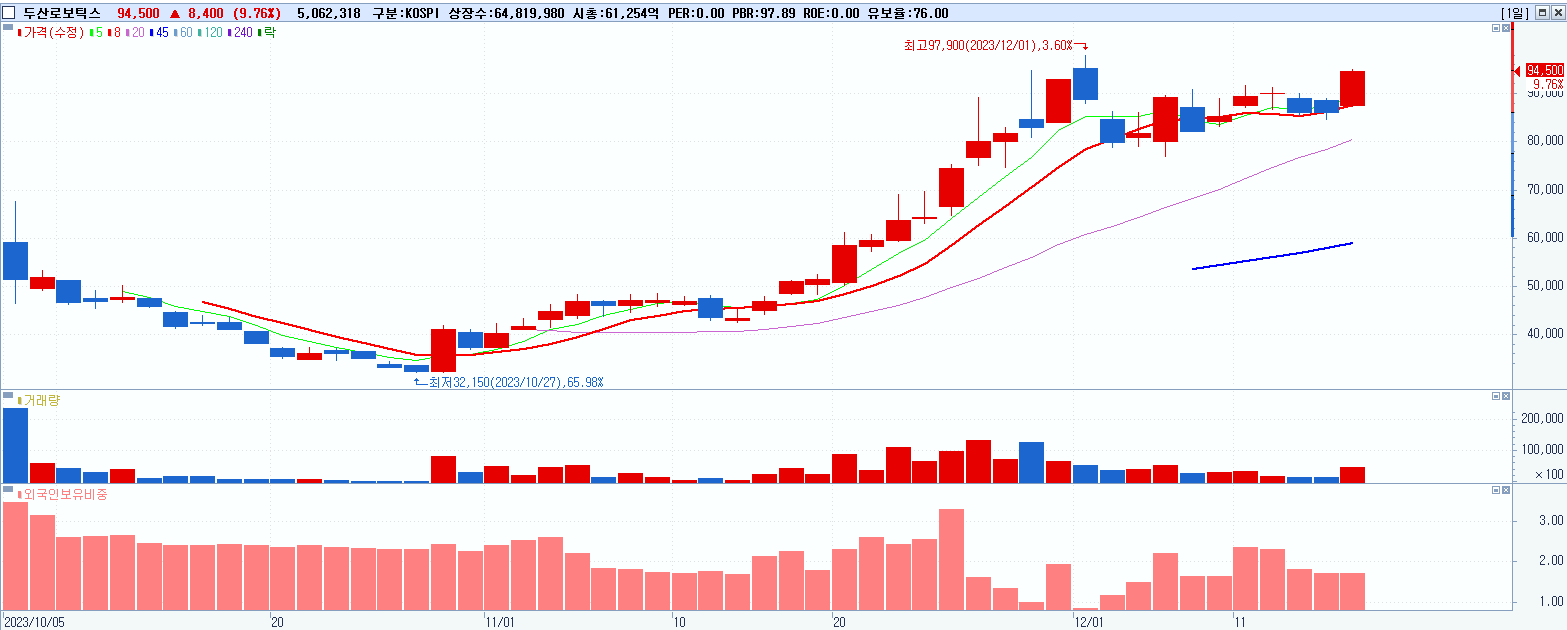 - 두산로보틱스 (94,500원 ▲ 9.76% , 시총: 61,255억, 거래량: 5,090,990, 거래대금:4,651억)