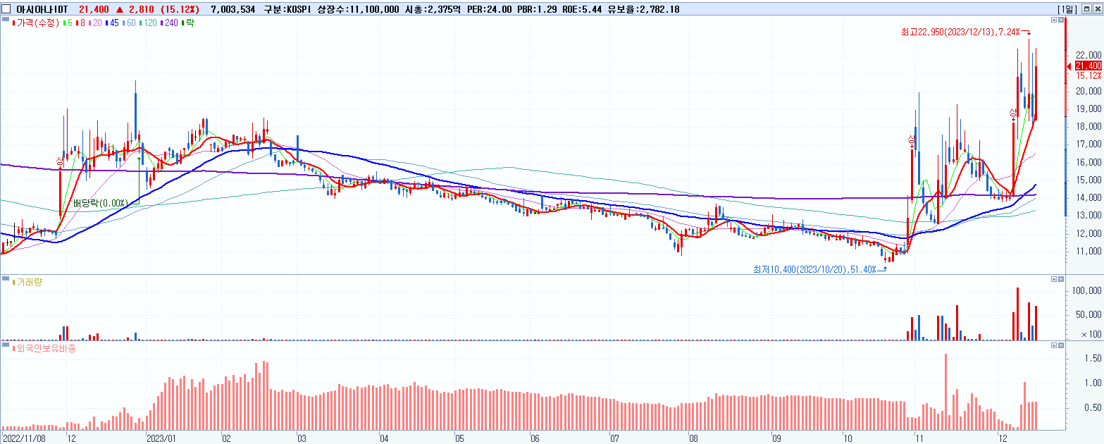 - 아시아나IDT (21,400원 ▲ 15.12% , 시총: 2,375억, 거래량: 7,085,785, 거래대금:1,474억)