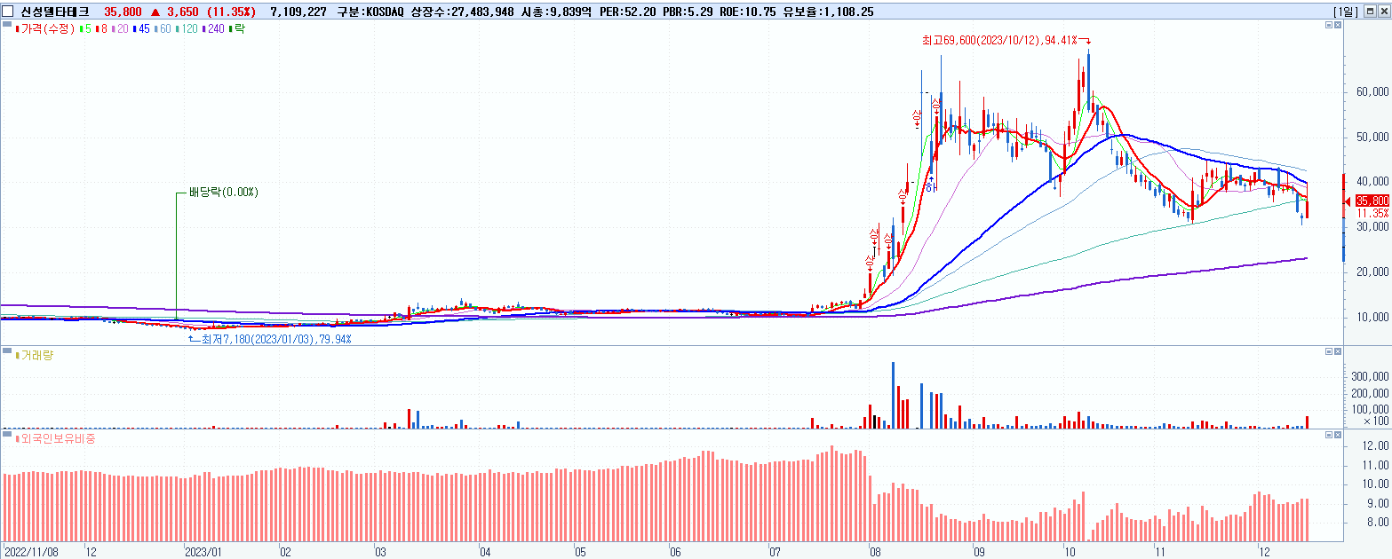- 신성델타테크 (35,800원 ▲ 11.35% , 시총: 9,839억, 거래량: 7,128,121, 거래대금:2,620억)