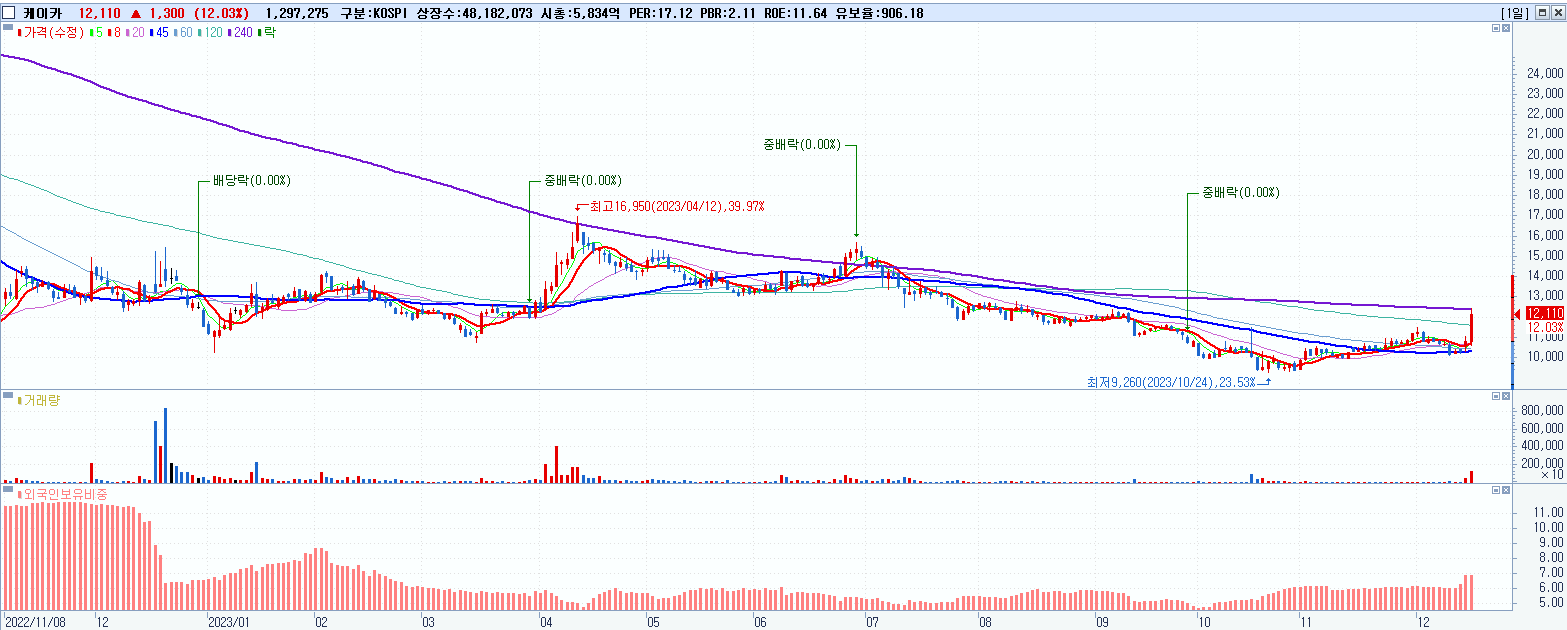 - 케이카 (12,110원 ▲ 12.03% , 시총: 5,835억, 거래량: 1,298,874, 거래대금:153억)