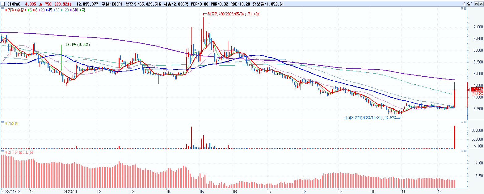 - SIMPAC (4,335원 ▲ 20.92% , 시총: 2,836억, 거래량: 12,924,085, 거래대금:560억)