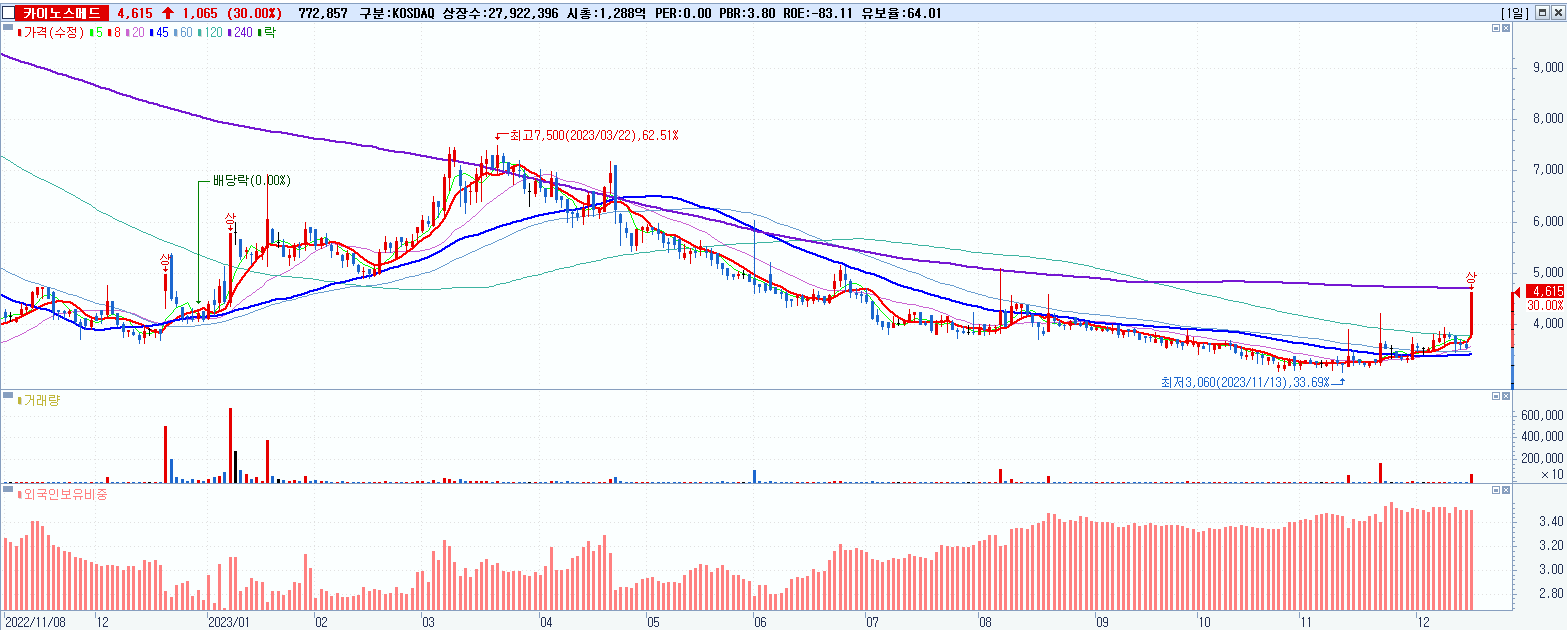 - 카이노스메드 (4,615원 ▲ 30% , 시총: 1,289억, 거래량: 772,857, 거래대금:34억)