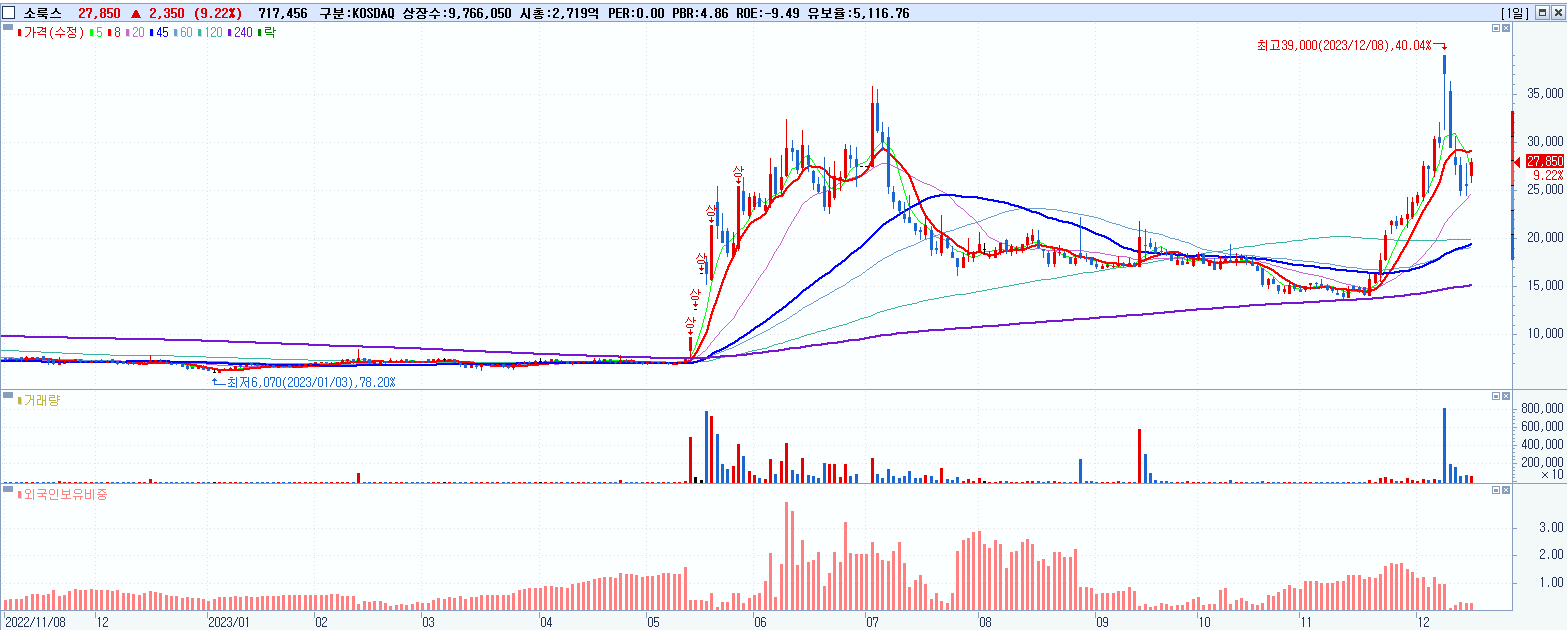 - 소룩스 (27,850원 ▲ 9.22% , 시총: 2,720억, 거래량: 725,410, 거래대금:197억)