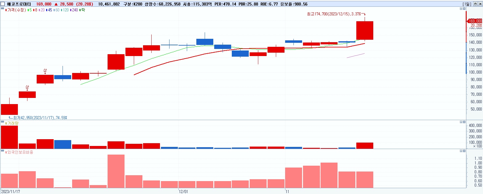 - 에코프로머티 (169,000원 ▲ 20.28% , 시총: 115,304억, 거래량: 10,495,463, 거래대금:16,702억)