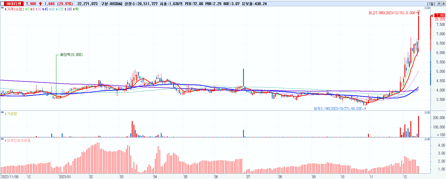 - 아이티센 (7,980원 ▲ 29.97% , 시총: 1,637억, 거래량: 22,379,795, 거래대금:1,638억)