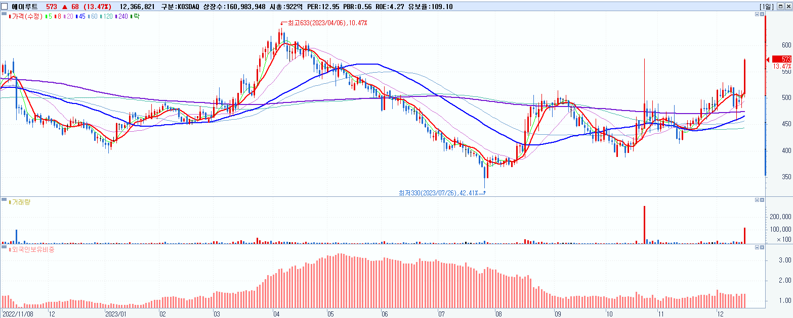 - 에이루트 (573원 ▲ 13.47% , 시총: 922억, 거래량: 12,429,803, 거래대금:69억)