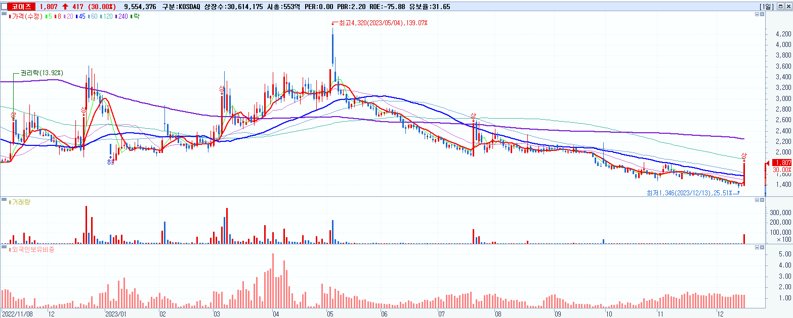 - 코이즈 (1,807원 ▲ 30% , 시총: 553억, 거래량: 9,558,784, 거래대금:166억)