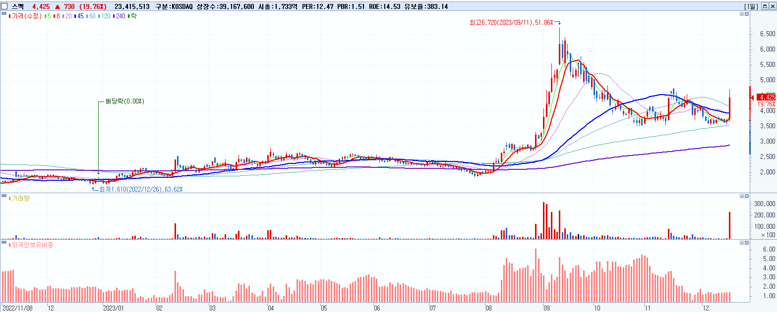 - 스맥 (4,425원 ▲ 19.76% , 시총: 1,733억, 거래량: 23,499,474, 거래대금:1,028억)