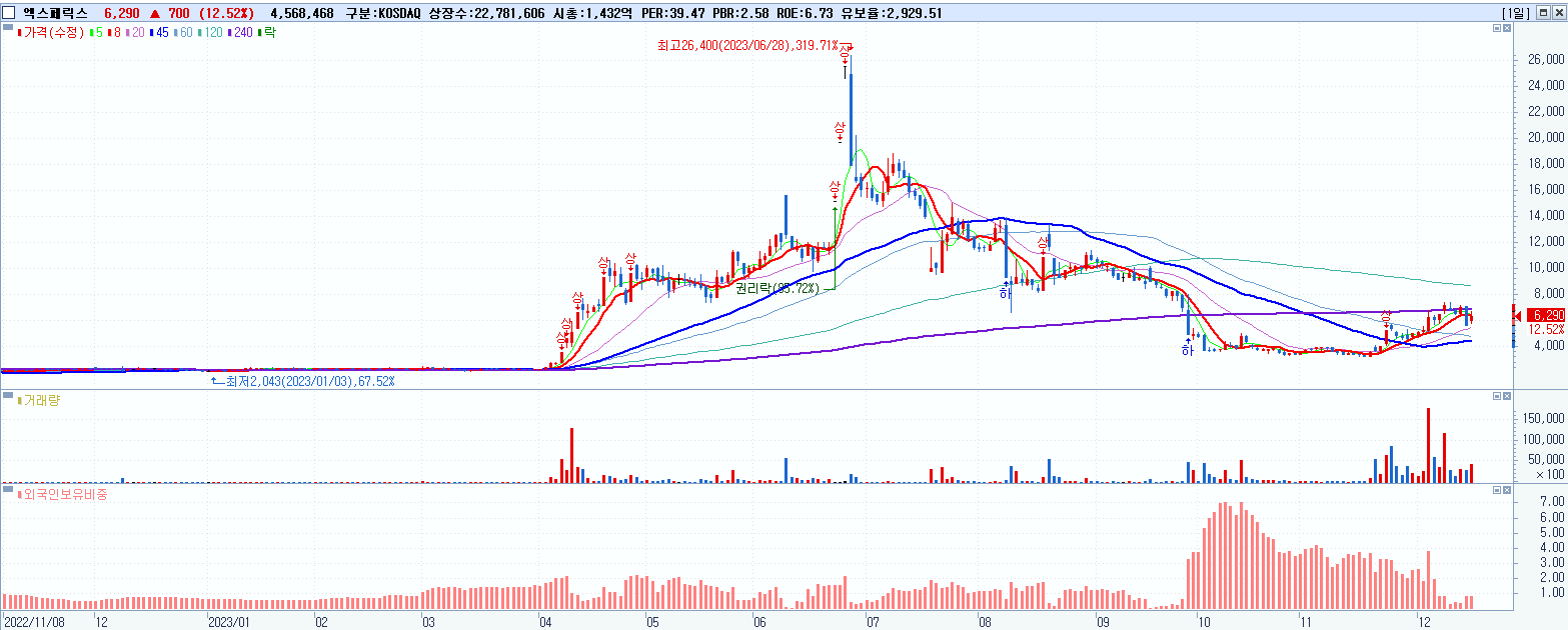 - 엑스페릭스 (6,290원 ▲ 12.52% , 시총: 1,433억, 거래량: 4,579,727, 거래대금:287억)