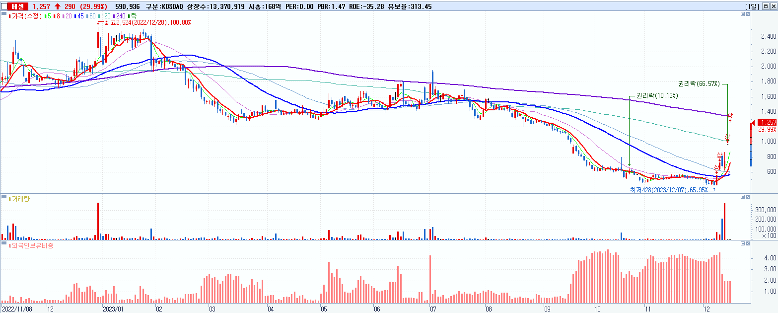 - 베셀 (1,257원 ▲ 29.99% , 시총: 168억, 거래량: 591,166, 거래대금:7억)