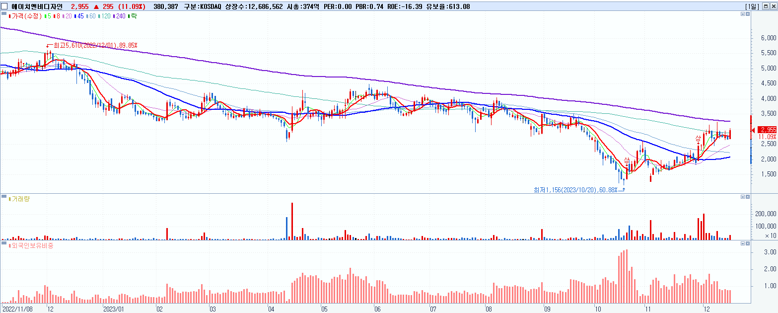 - 에이치앤비디자인 (2,955원 ▲ 11.09% , 시총: 375억, 거래량: 380,491, 거래대금:11억)
