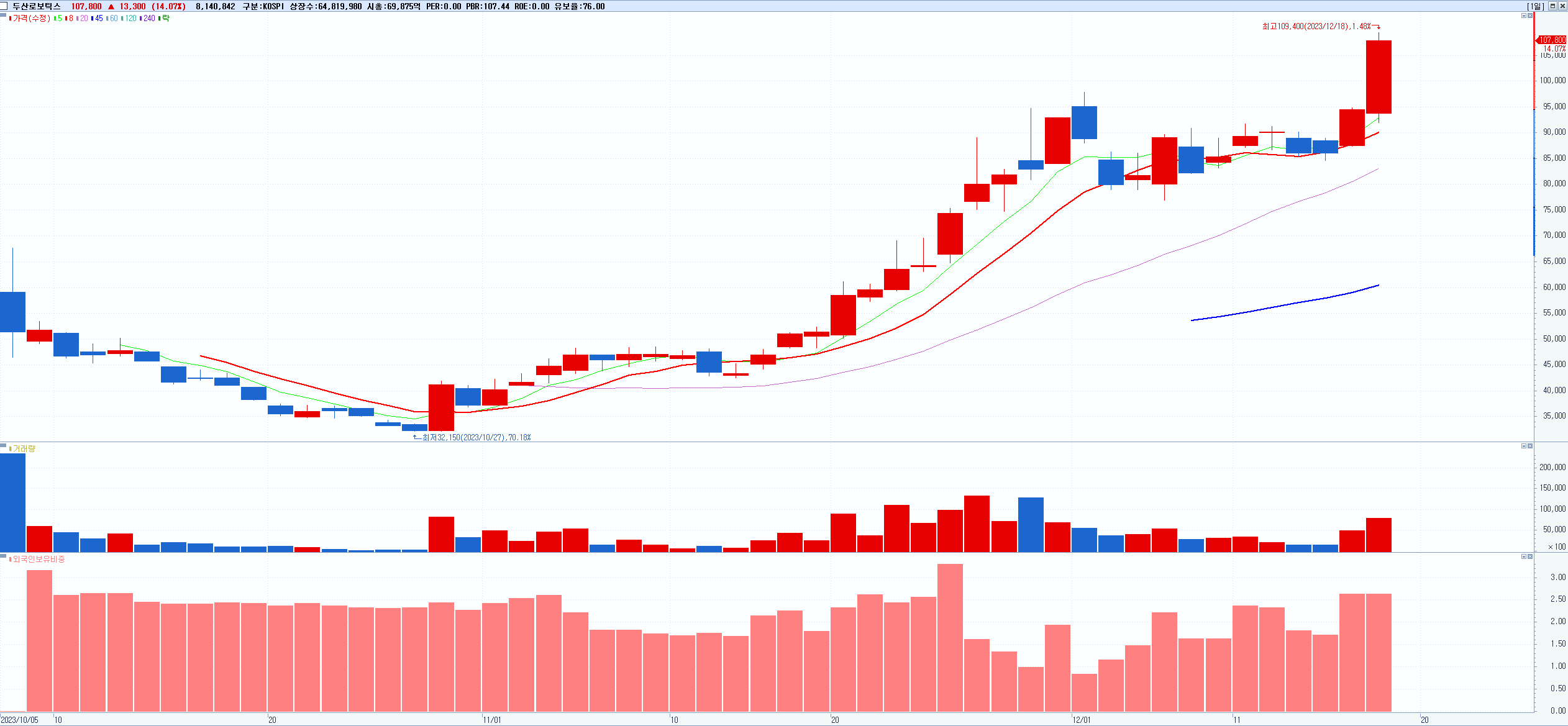 - 두산로보틱스 (107,800원 ▲ 14.07% , 시총: 69,876억, 거래량: 8,163,353, 거래대금:8,164억)