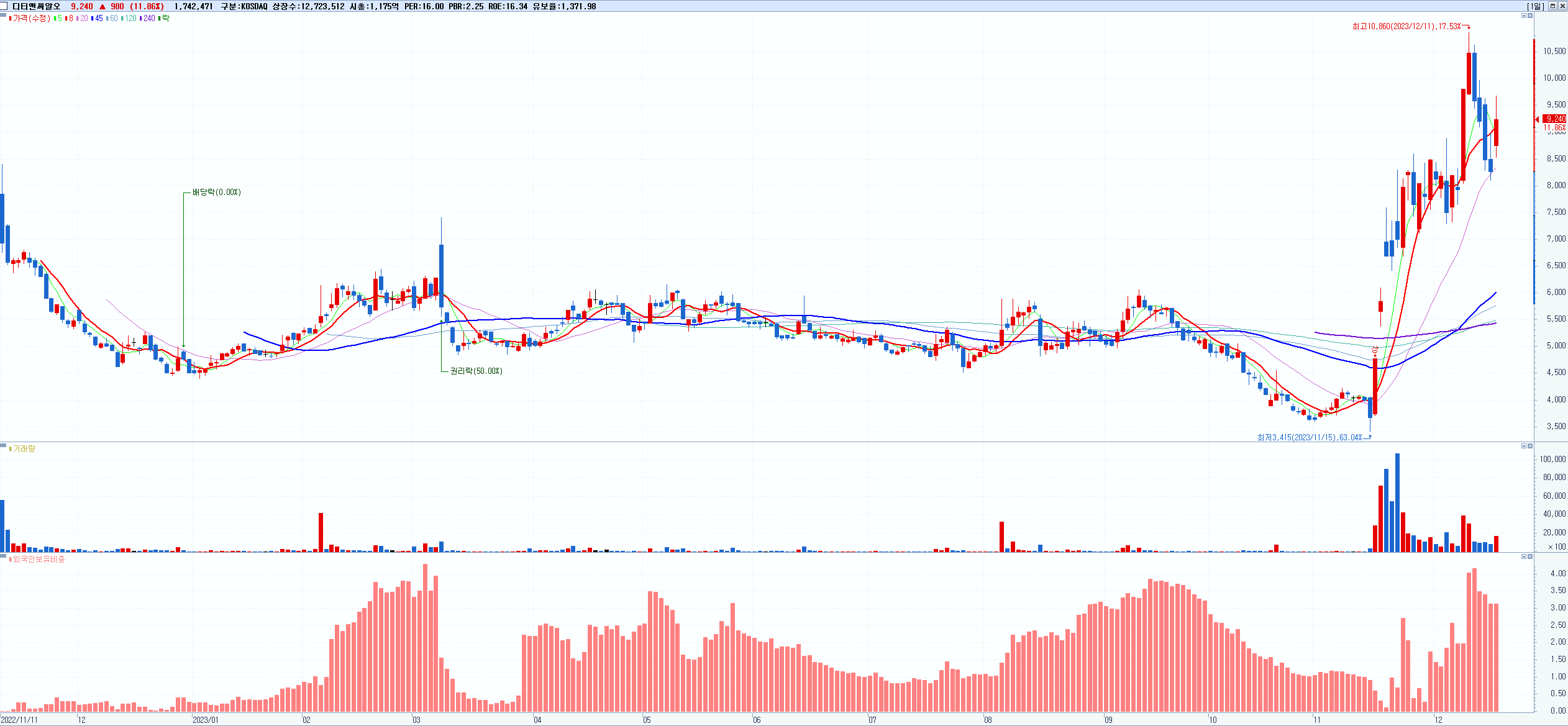 - 디티앤씨알오 (9,240원 ▲ 11.86% , 시총: 1,176억, 거래량: 1,747,487, 거래대금:161억)