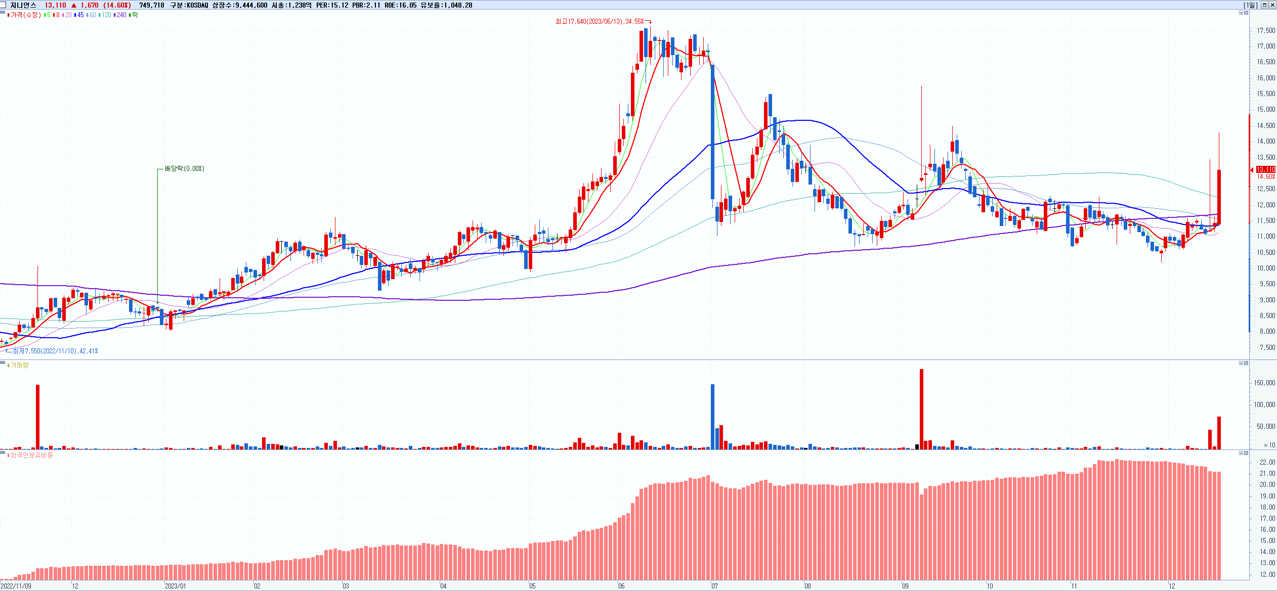 - 지니언스 (13,110원 ▲ 14.6% , 시총: 1,238억, 거래량: 750,539, 거래대금:99억)