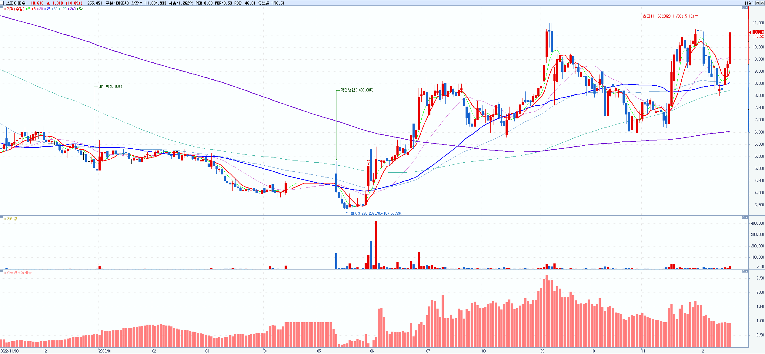 - 스피어파워 (10,610원 ▲ 14.09% , 시총: 1,262억, 거래량: 255,456, 거래대금:26억)