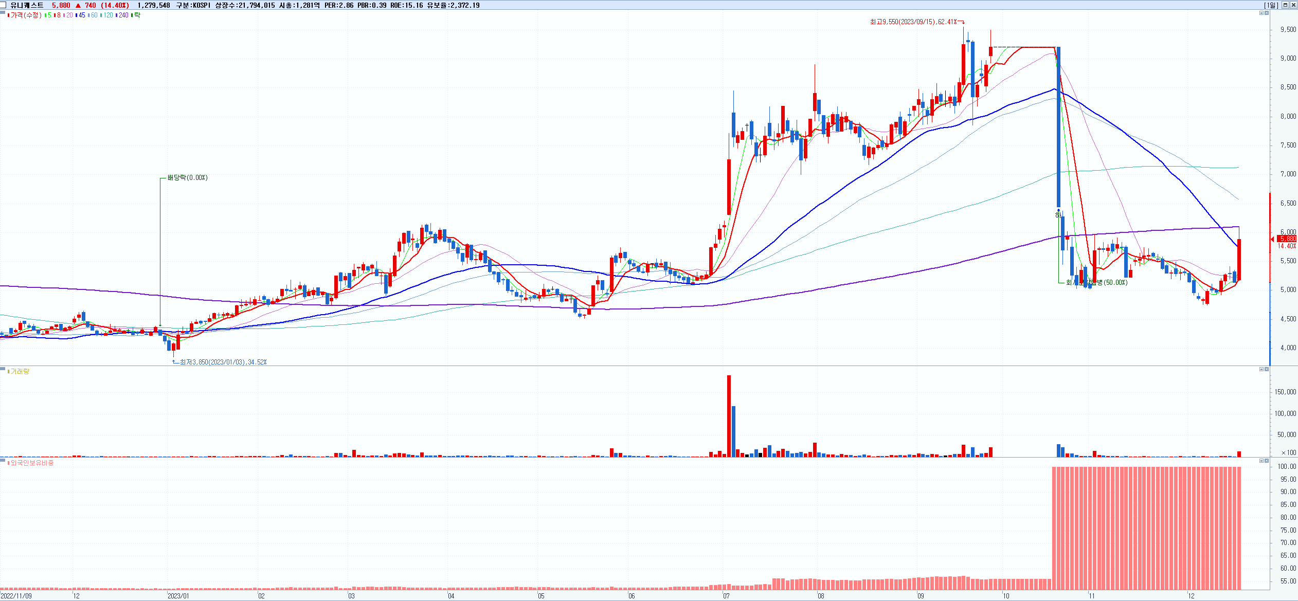 - 유니퀘스트 (5,880원 ▲ 14.4% , 시총: 1,281억, 거래량: 1,283,724, 거래대금:73억)
