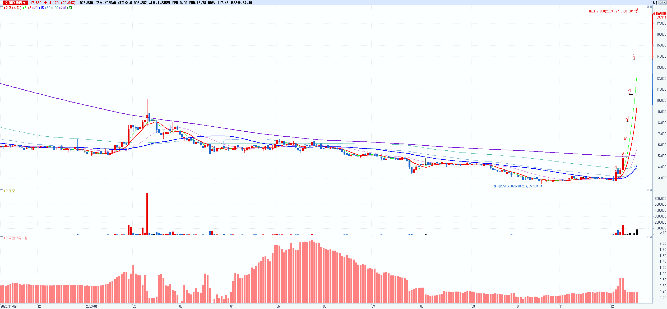 - 와이더플래닛 (17,880원 ▲ 29.94% , 시총: 1,235억, 거래량: 931,470, 거래대금:167억)