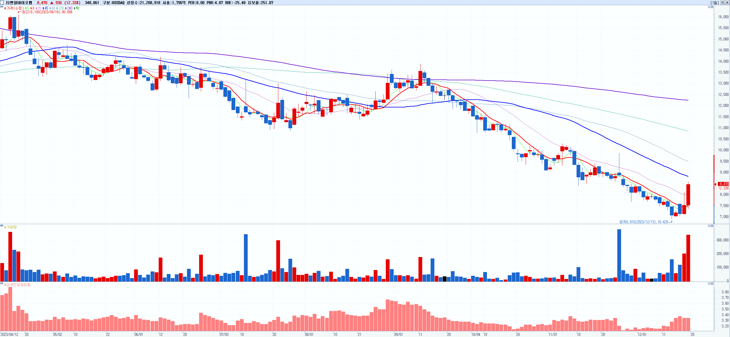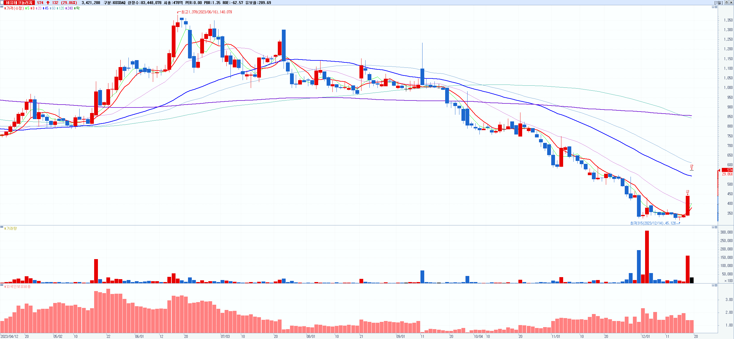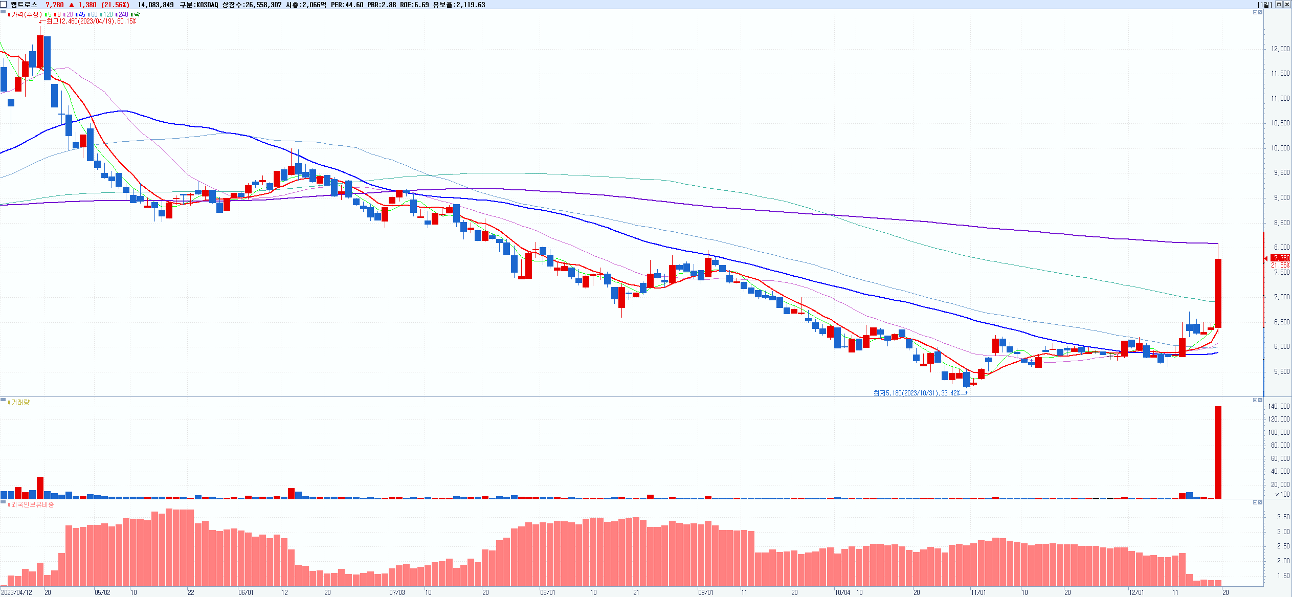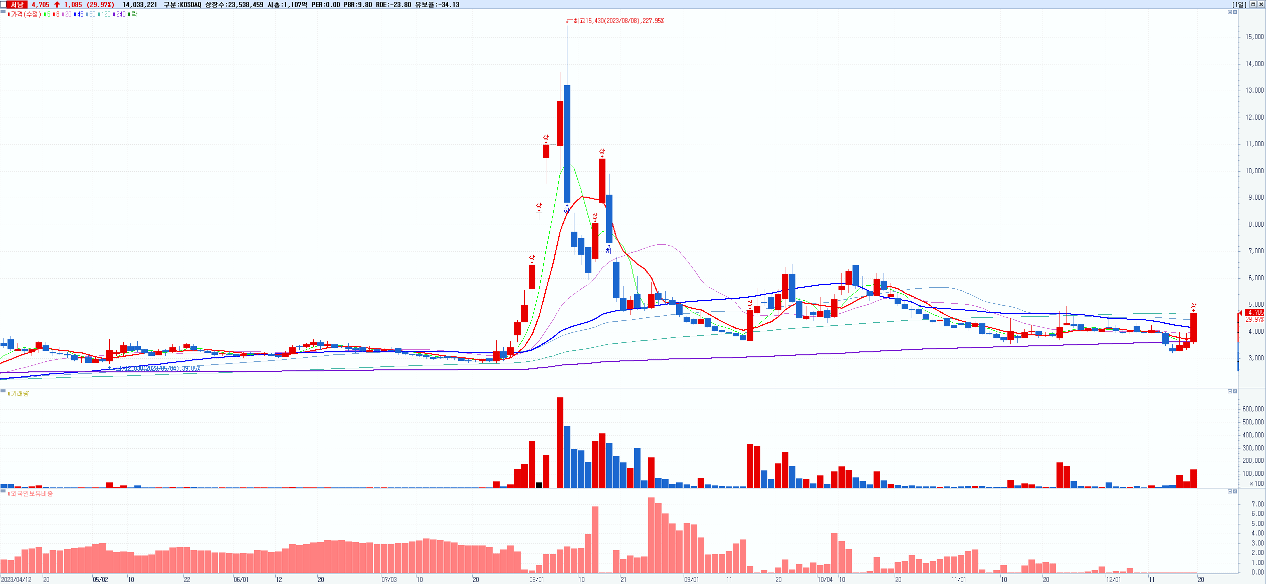 시총: 1,107억 거래량: 14,033,943 거래대금:636억