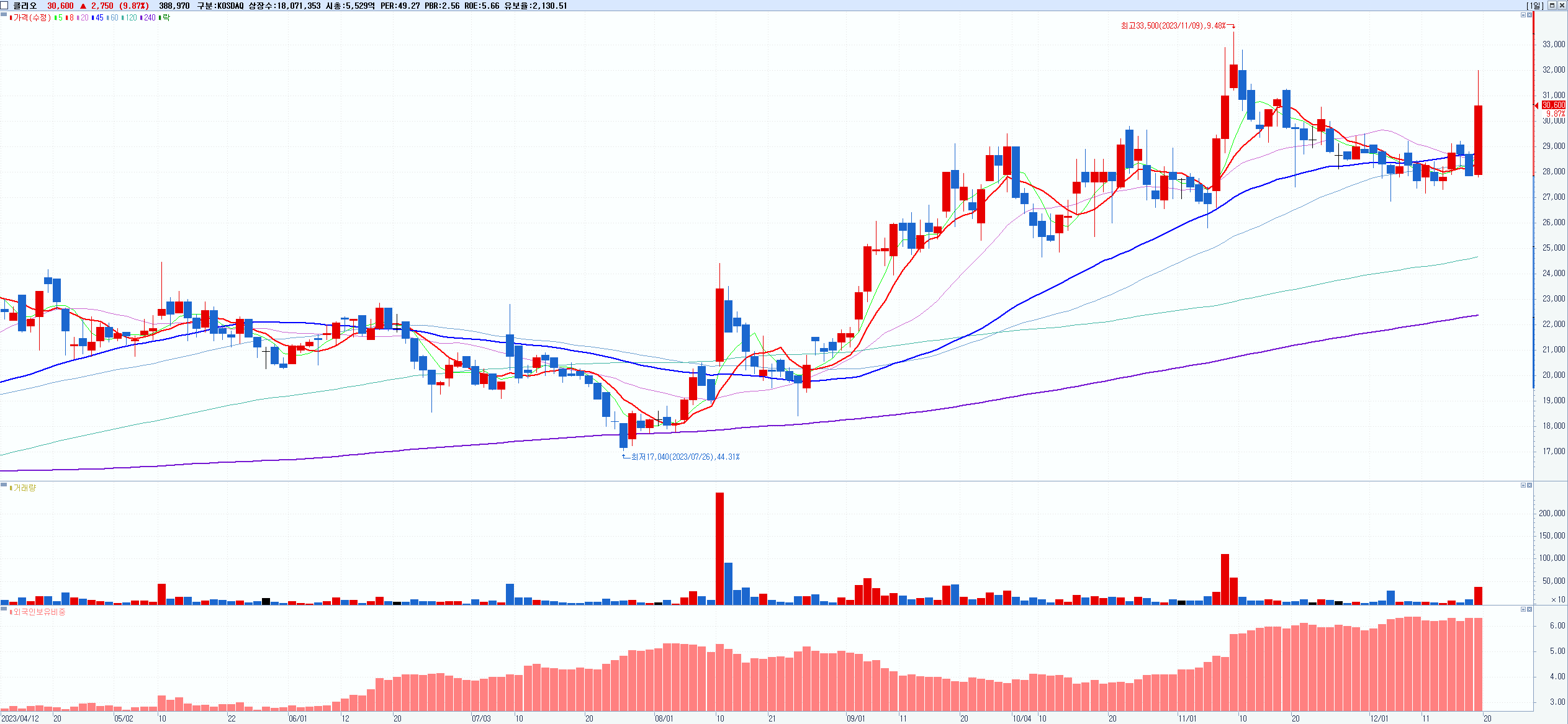 - 클리오 (30,600원 ▲ 9.87% , 시총: 5,530억, 거래량: 391,517, 거래대금:120억)