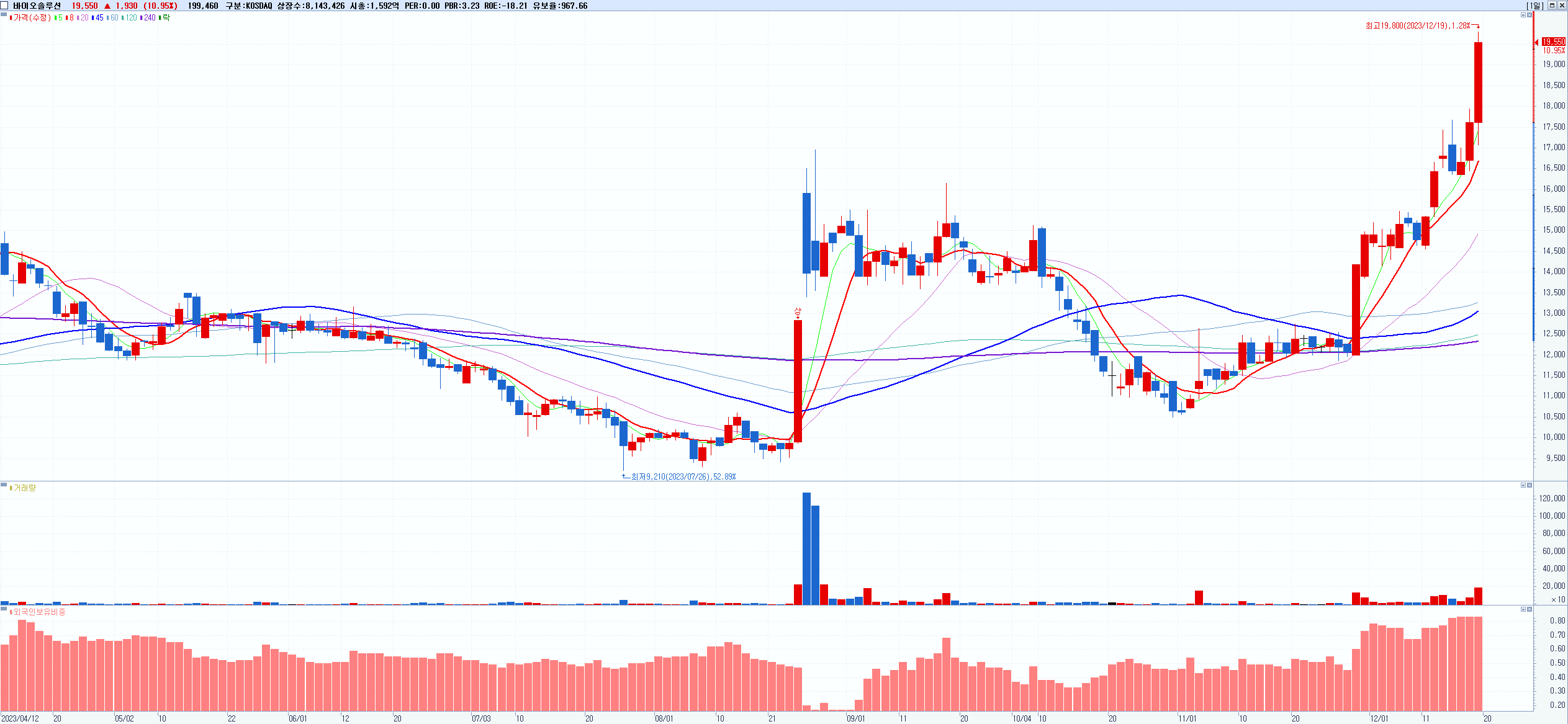 - 바이오솔루션 (19,550원 ▲ 10.95% , 시총: 1,592억, 거래량: 199,776, 거래대금:38억)