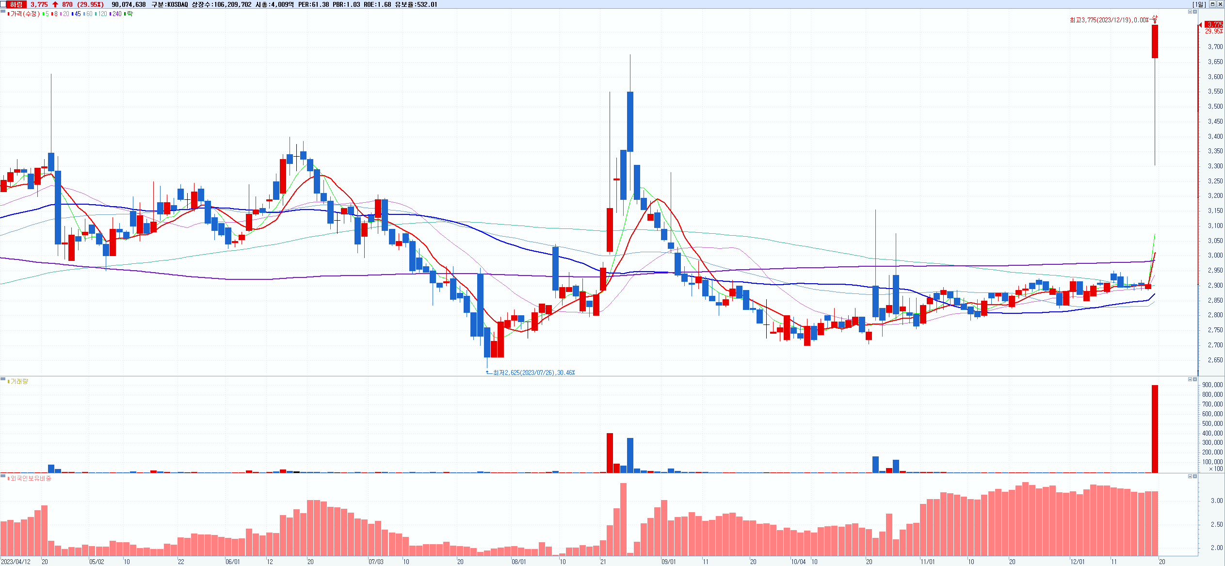2.하림 3,775원 ▲ 29.95% (KOSDAQ, 136480)