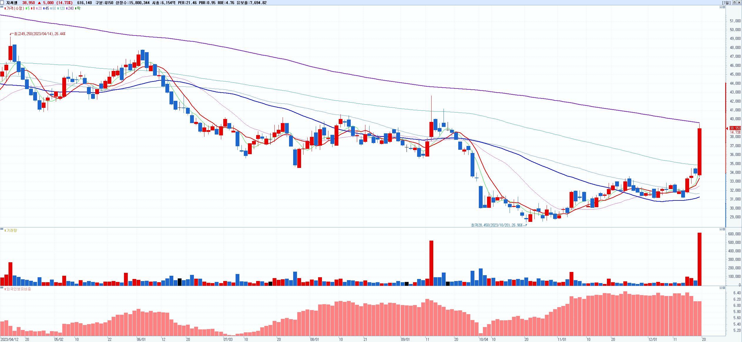 - 지씨셀 (38,950원 ▲ 14.73% , 시총: 6,154억, 거래량: 617,318, 거래대금:233억)