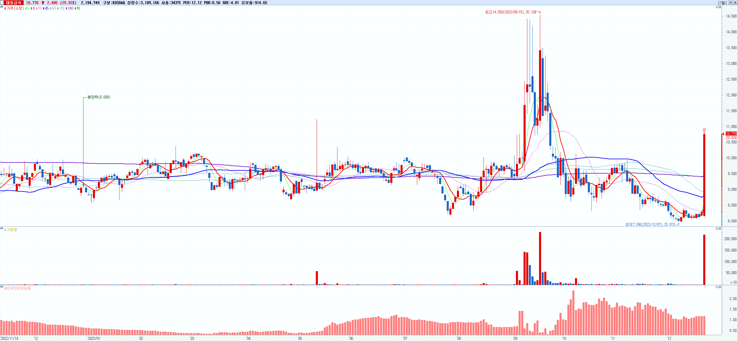 시총: 3,613억 거래량: 7,718,634 거래대금:360억