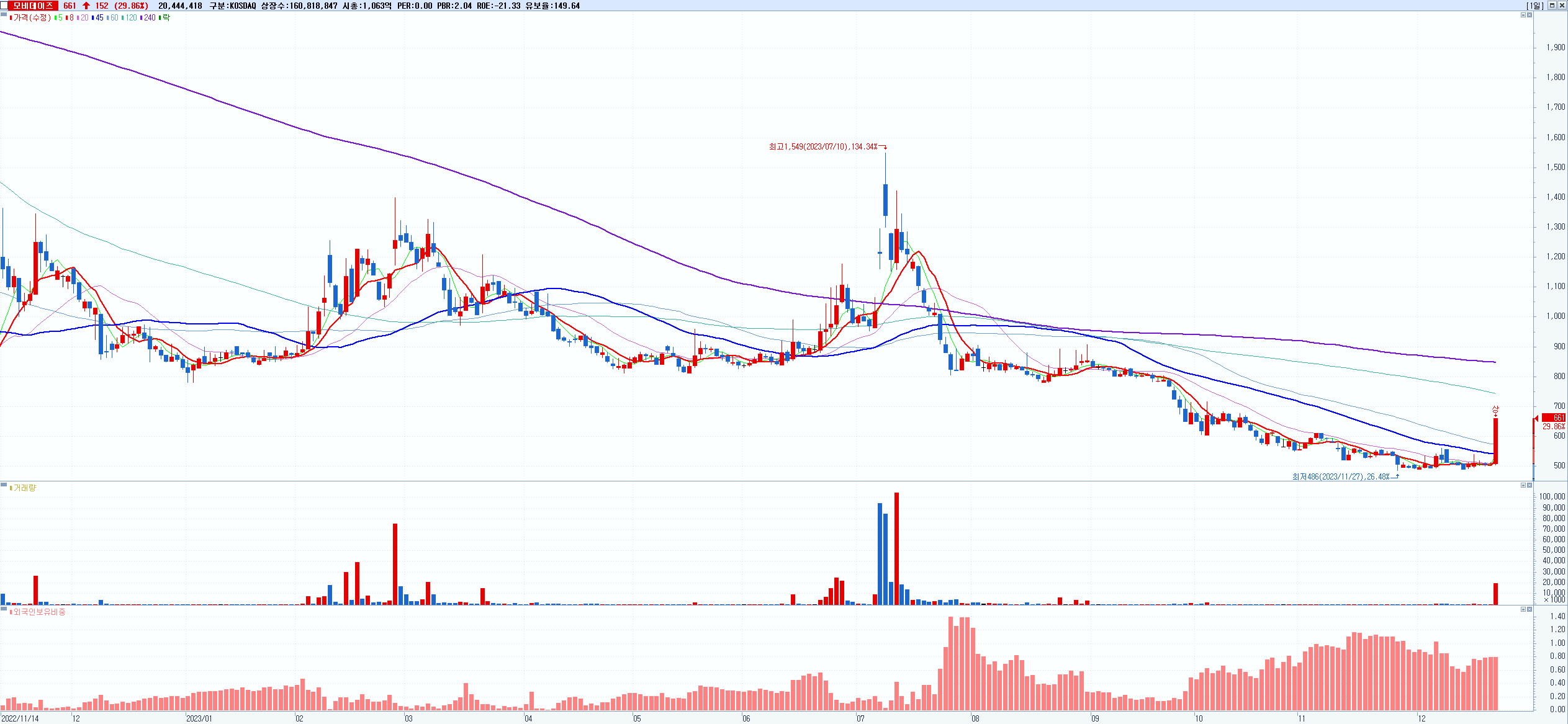 - 모비데이즈 (661원 ▲ 29.86% , 시총: 1,063억, 거래량: 20,448,271, 거래대금:128억)