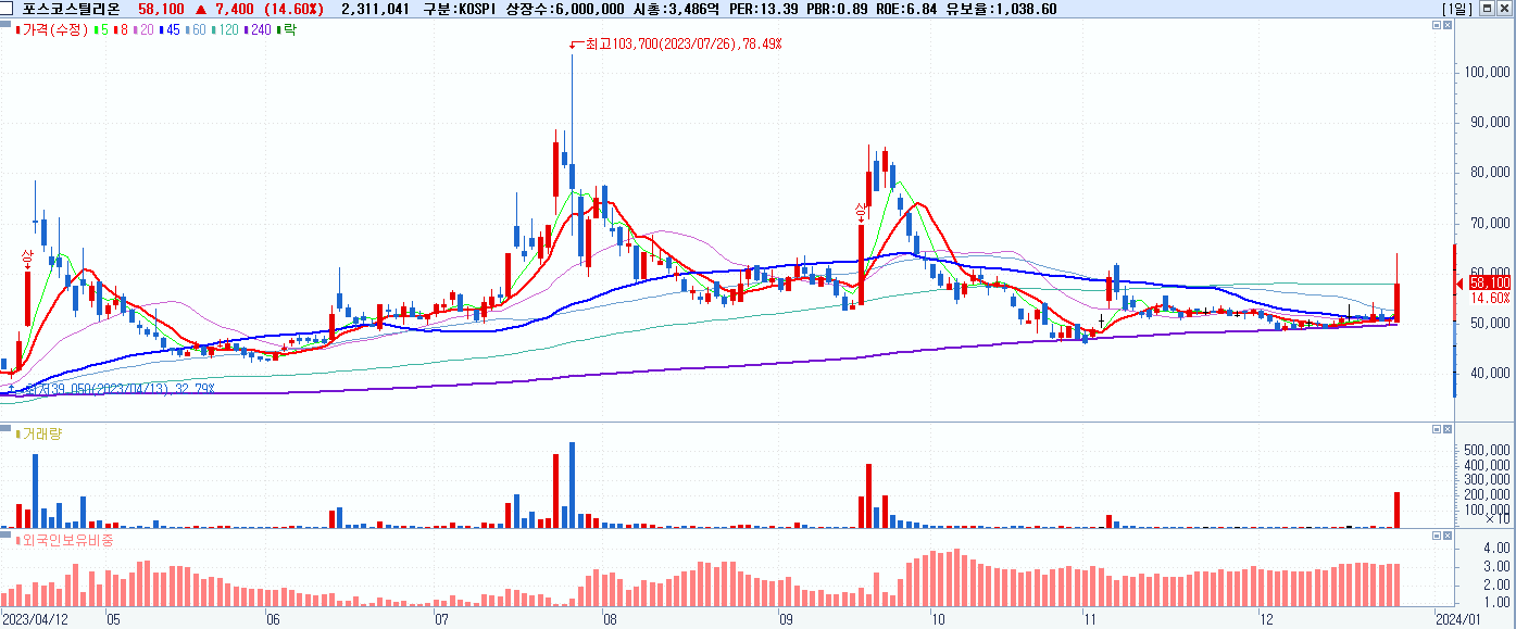 - 포스코스틸리온 (58,100원 ▲ 14.6% , 시총: 3,486억, 거래량: 2,336,606, 거래대금:1,395억)