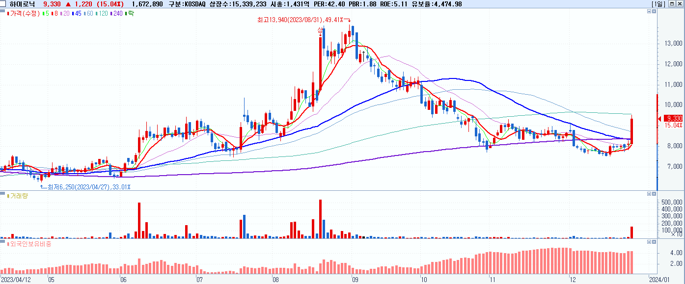 - 하이로닉 (9,330원 ▲ 15.04% , 시총: 1,431억, 거래량: 1,682,731, 거래대금:152억)