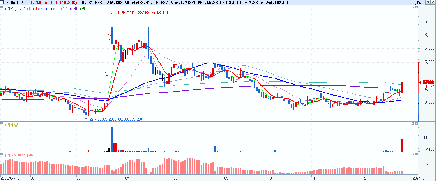 - HLB파나진 (4,250원 ▲ 10.39% , 시총: 1,743억, 거래량: 9,310,220, 거래대금:413억)