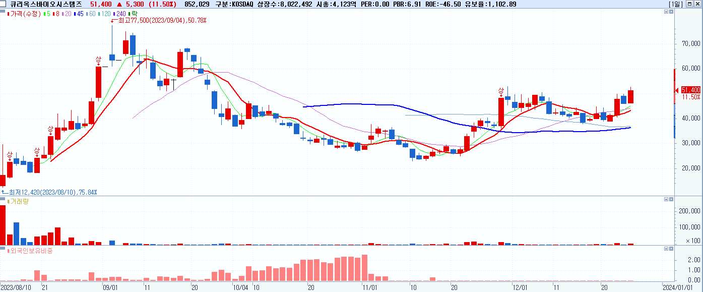 - 큐리옥스바이오시스템즈 (51,400원 ▲ 11.5% , 시총: 4,124억, 거래량: 858,581, 거래대금:428억)