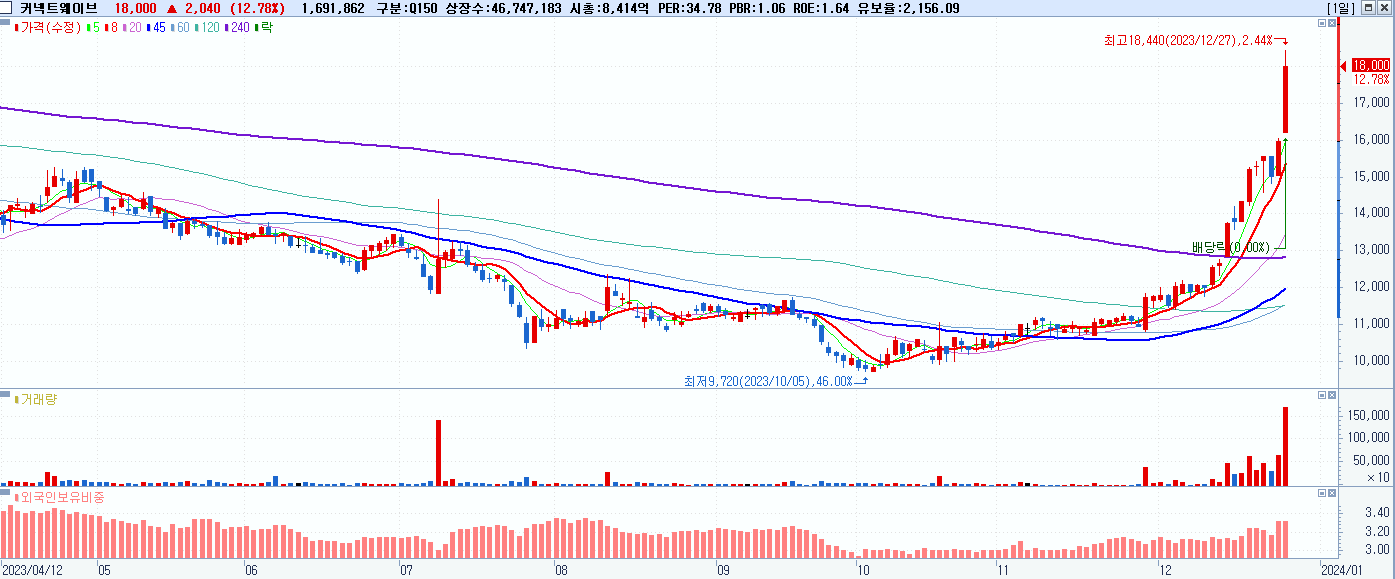 - 커넥트웨이브 (18,000원 ▲ 12.78% , 시총: 8,414억, 거래량: 1,695,809, 거래대금:300억)