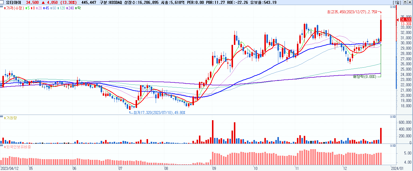 - 유티아이 (34,500원 ▲ 13.3% , 시총: 5,619억, 거래량: 445,945, 거래대금:147억)