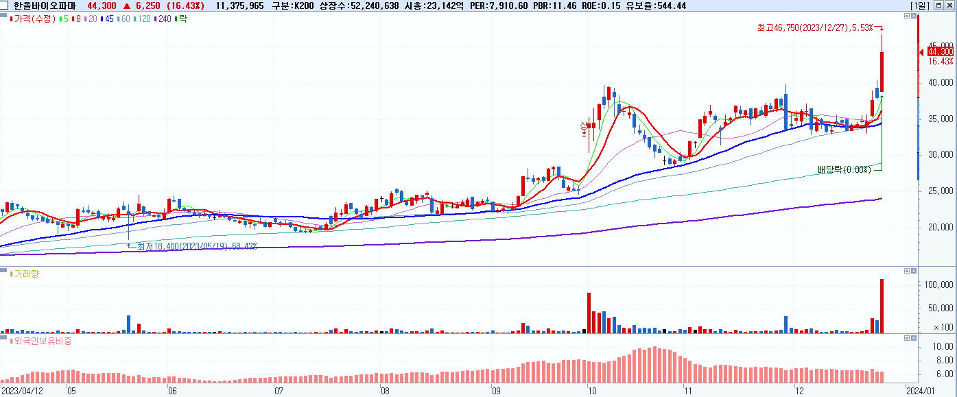 - 한올바이오파마 (44,300원 ▲ 16.43% , 시총: 23,143억, 거래량: 11,451,855, 거래대금:4,991억)