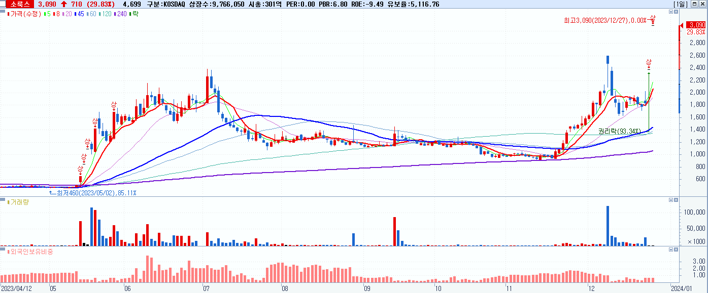- 소룩스 (3,090원 ▲ 29.83% , 시총: 302억, 거래량: 4,884, 거래대금:0억)