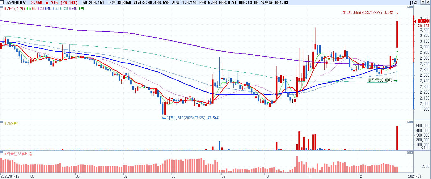 - 우리바이오 (3,450원 ▲ 26.14% , 시총: 1,671억, 거래량: 50,881,329, 거래대금:1,706억)