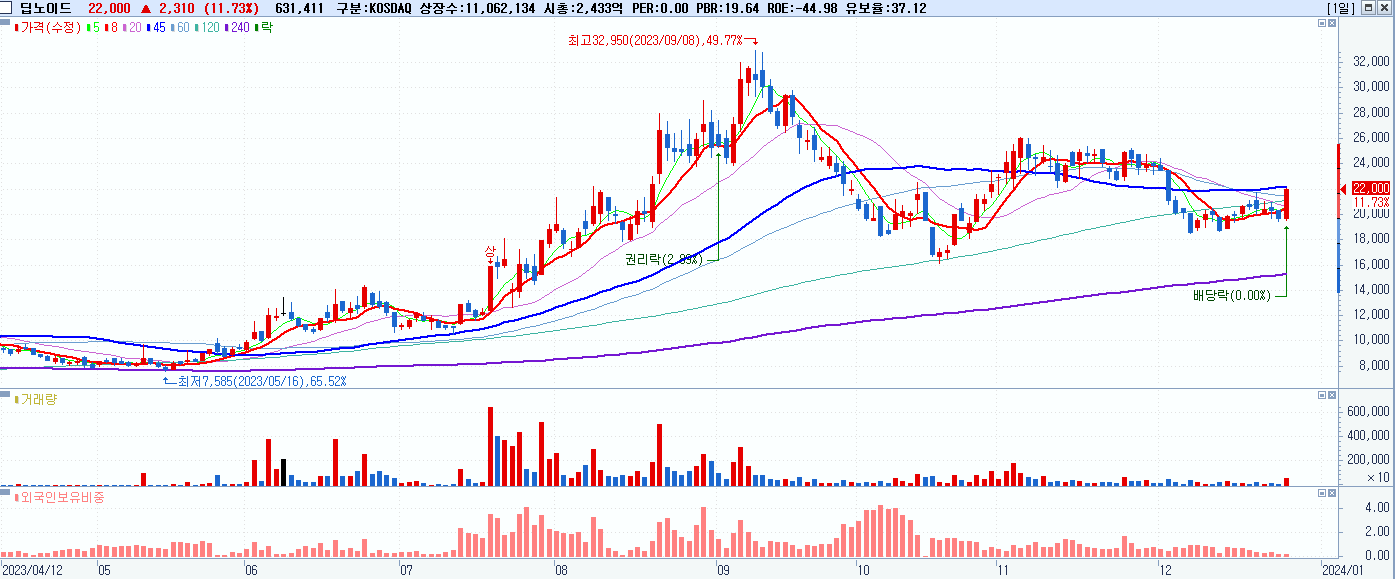- 딥노이드 (22,000원 ▲ 11.73% , 시총: 2,434억, 거래량: 635,449, 거래대금:135억)