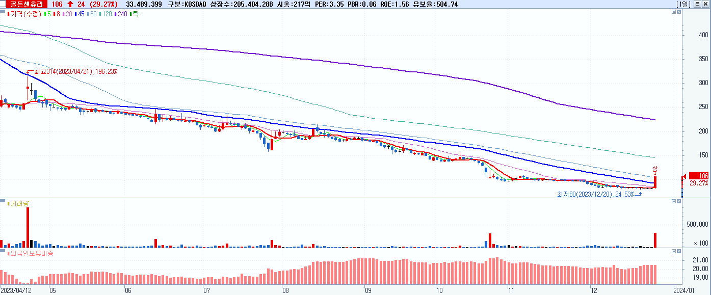 - 골든센츄리 (106원 ▲ 29.27% , 시총: 218억, 거래량: 33,505,676, 거래대금:34억)