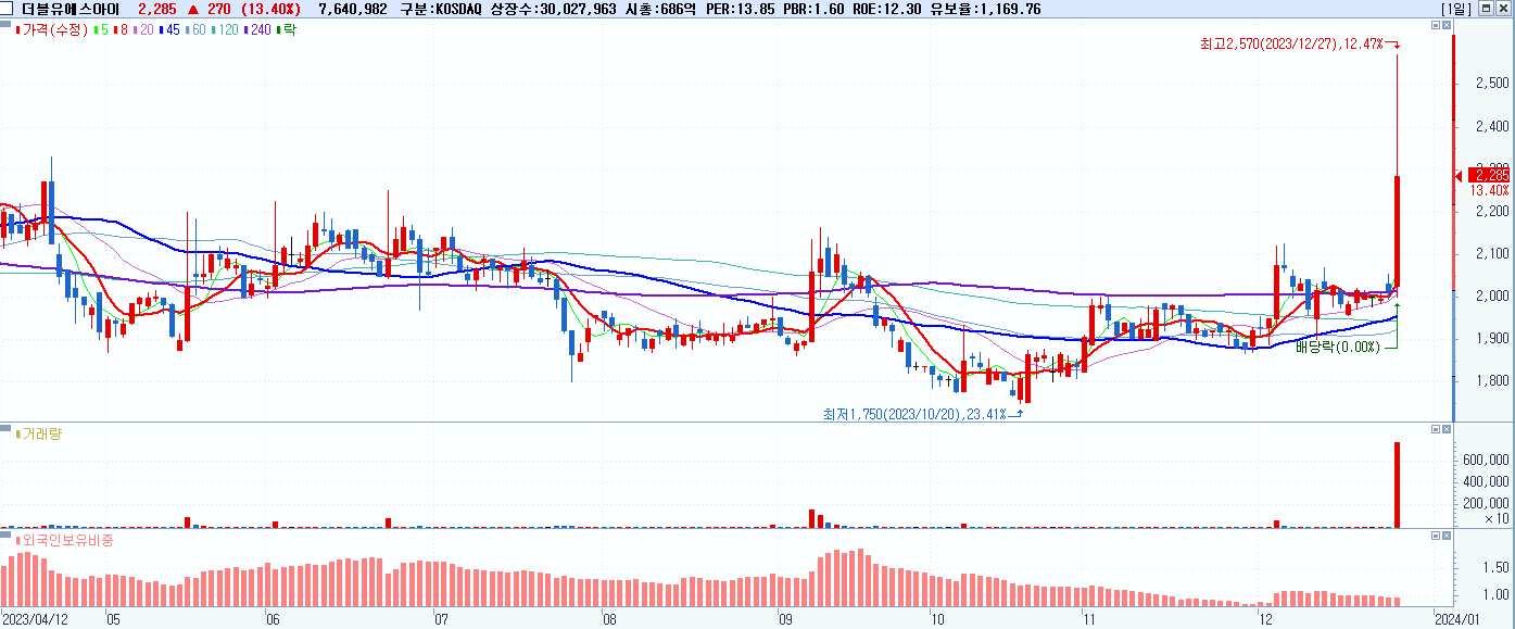 - 더블유에스아이 (2,285원 ▲ 13.4% , 시총: 686억, 거래량: 8,028,524, 거래대금:191억)
