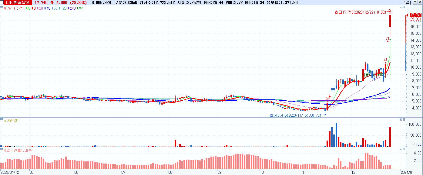 - 디티앤씨알오 (17,740원 ▲ 29.96% , 시총: 2,257억, 거래량: 8,807,769, 거래대금:1,484억)