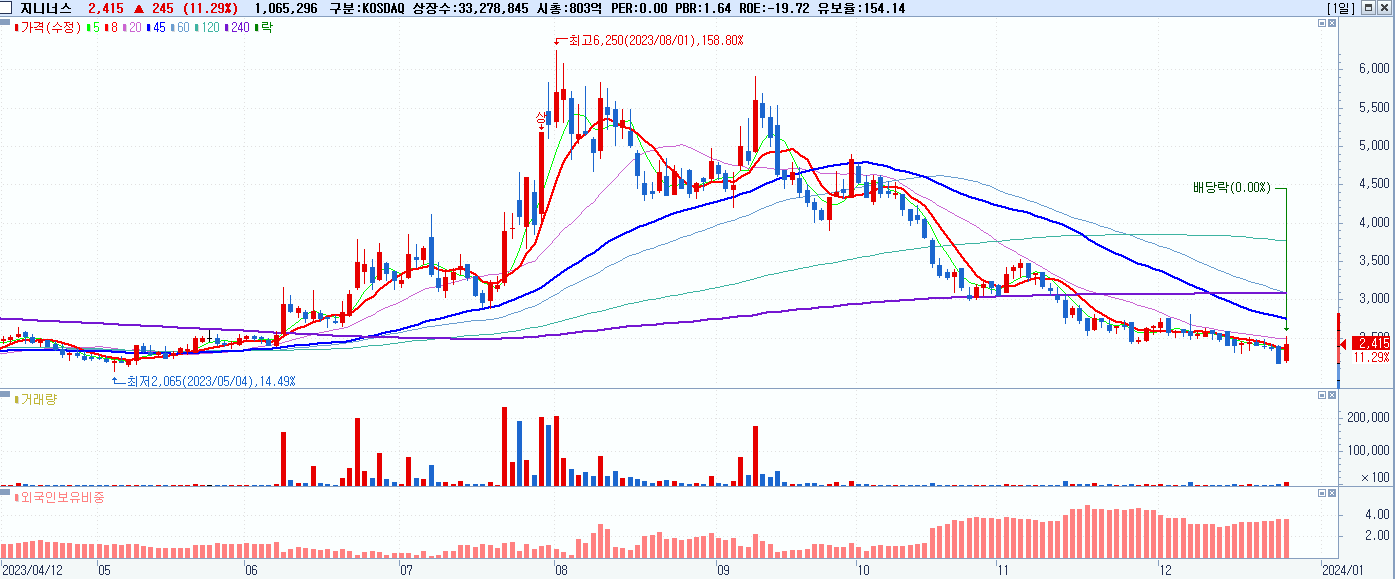 - 지니너스 (2,415원 ▲ 11.29% , 시총: 804억, 거래량: 1,068,088, 거래대금:26억)