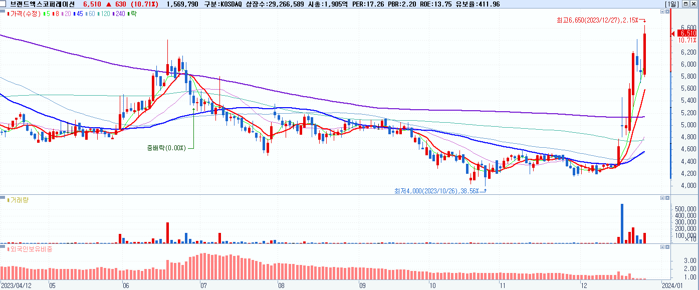 - 브랜드엑스코퍼레이션 (6,510원 ▲ 10.71% , 시총: 1,905억, 거래량: 1,578,330, 거래대금:101억)