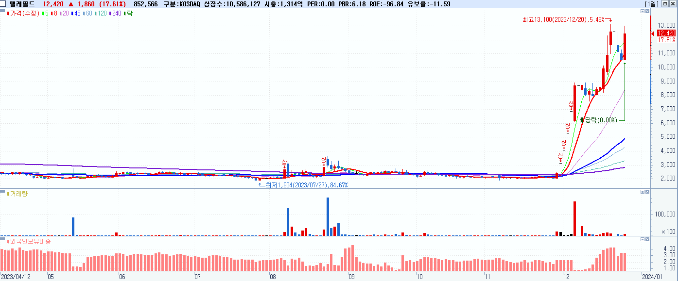 - 텔레필드 (12,420원 ▲ 17.61% , 시총: 1,315억, 거래량: 858,475, 거래대금:104억)