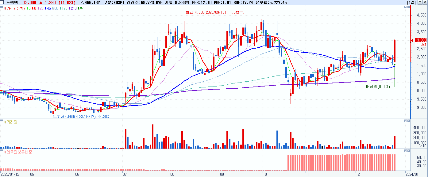 - 드림텍 (13,000원 ▲ 11.02% , 시총: 8,934억, 거래량: 2,480,152, 거래대금:313억)