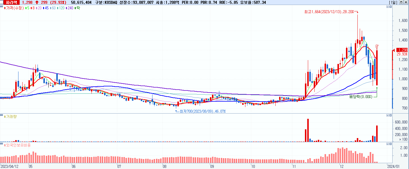 - 파라텍 (1,298원 ▲ 29.93% , 시총: 1,208억, 거래량: 51,098,473, 거래대금:610억)